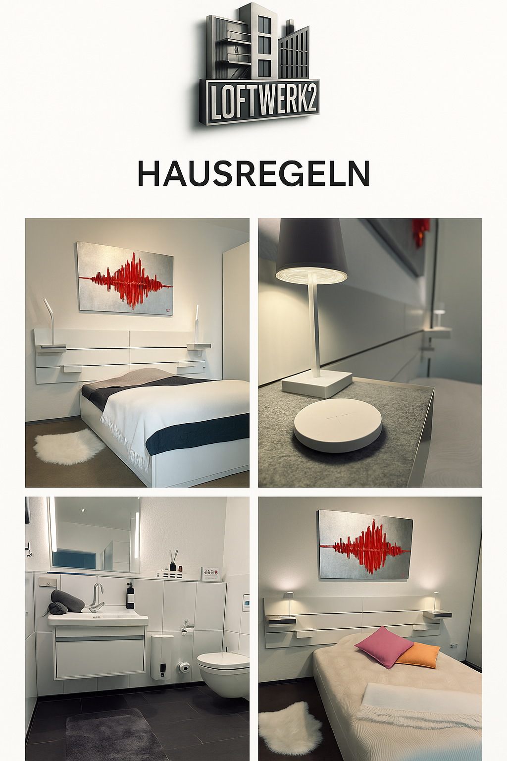 Damit sich alle Gäste im LoftWerk2 wohlfühlen, bitten wir Sie, folgende Regeln zu beachten: 🚭 Nichtraucher-Loft Bitte rauchen Sie ausschließlich im Außenbereich – das Loft ist eine rauchfreie Zone. 🕙 Ruhezeiten Von 22:00 Uhr bis 07:00 Uhr bitten wir um Rücksicht auf Nachbarn. Laute Musik, Partys und Besuchergruppen sind nicht gestattet. 🐾 Haustiere Auf Anfrage sind kleine, stubenreine Hunde willkommen. Bitte teilen Sie uns das vorab mit. ♻️ Müll & Ordnung Müll bitte trennen – entsprechende Behälter sind vorhanden.Bitte hinterlassen Sie das Loft ordentlich – vielen Dank für Ihre Mithilfe! 🔑 Schlüssel & Alarmanlage Verlust Schlüssel: 500 € Alarmanlagen-Chip: 100 € Bitte bewahren Sie beides sicher auf. 💧Bad & Hygiene Duschgel, Shampoo & Handseife stehen bereit (siehe Foto). Bitte keine Hygieneartikel in die Toilette werfen. 📵 Sicherheit Fenster & Türen beim Verlassen bitte immer schließen. Heiz- und Elektrogeräte nicht unbeaufsichtigt lassen. 💬 Kontakt bei Fragen Wir sind für Sie da! Per Airbnb-App, E-Mail oder telefonisch Dank der stilvollen Einrichtung und Ihrer Achtsamkeit bleibt das LoftWerk2 ein Ort zum Wohlfühlen für alle Gäste. Wir danken Ihnen für Ihr Verständnis & Ihre Mithilfe! 🙏